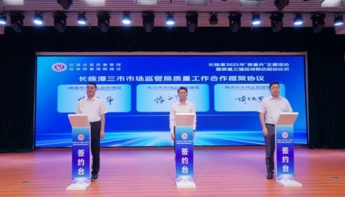 (长株潭三市市场监管局共同签署《长株潭质量工作合作框架协议》。单位供图)近日,长株潭2025年“质量月”主题活动暨质量“三强”区域联动启动仪式在隆平创新中心举行。这是长株潭三市深入贯彻落实“三个转变”的重要指示,紧扣湖南省委、省政府质量强省与长株潭一体化发展战略的关键行动,标志着长株潭质量工作进入互联互通、共建共享的全新阶段。