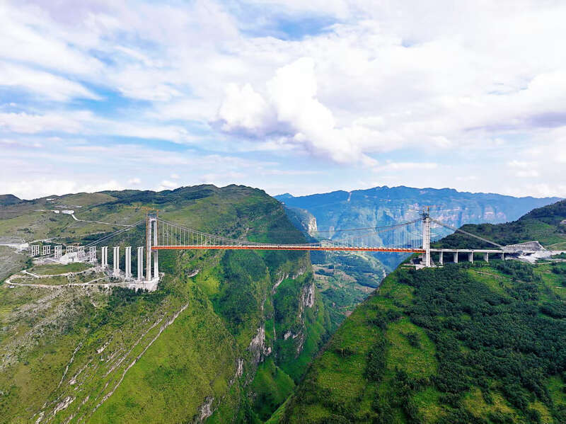 中国青年报客户端讯(赵宝龙 张纪林 王祥 李守钦 中青报·中青网记者 宋宝颖)9月23日上午,随着最后一节钢梁精准就位,由贵州交投集团有限公司投资建设、中铁广州工程局集团承建的安盘高速天门特大桥顺利实现合龙。这座横跨北盘江的超级工程,桥面距江面高度560米、全长1553米、主跨820米,建成后将成为峡谷地区世界第三高桥及全球最高双向六车道钢桁梁悬索桥,标志着我国桥梁建设技术再次取得重大突破。
